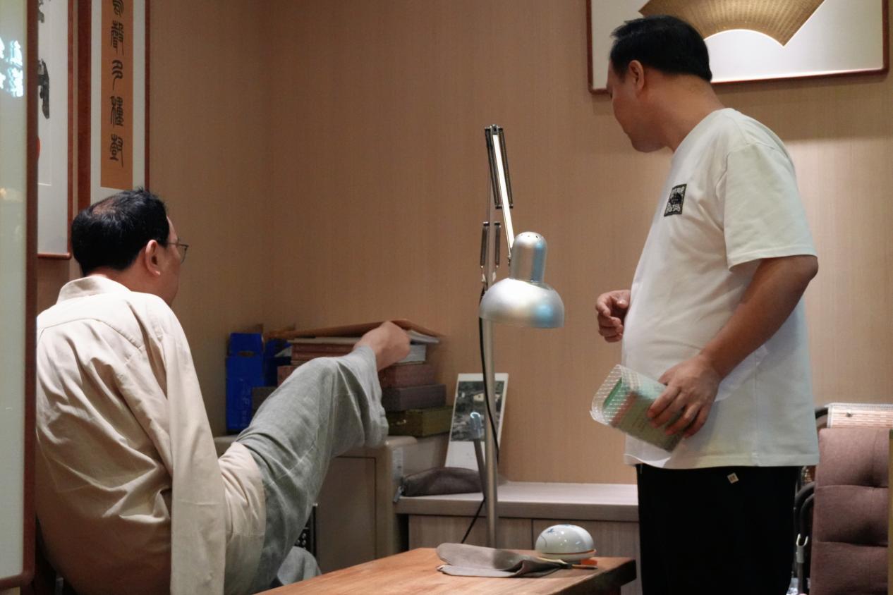 2024年6月,孔黎翔和恩师张耕源一起在西泠美术馆欣赏篆刻作品(受访者供图)