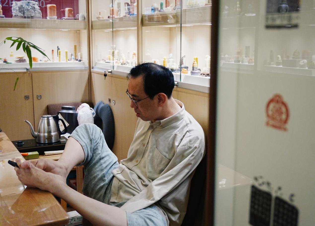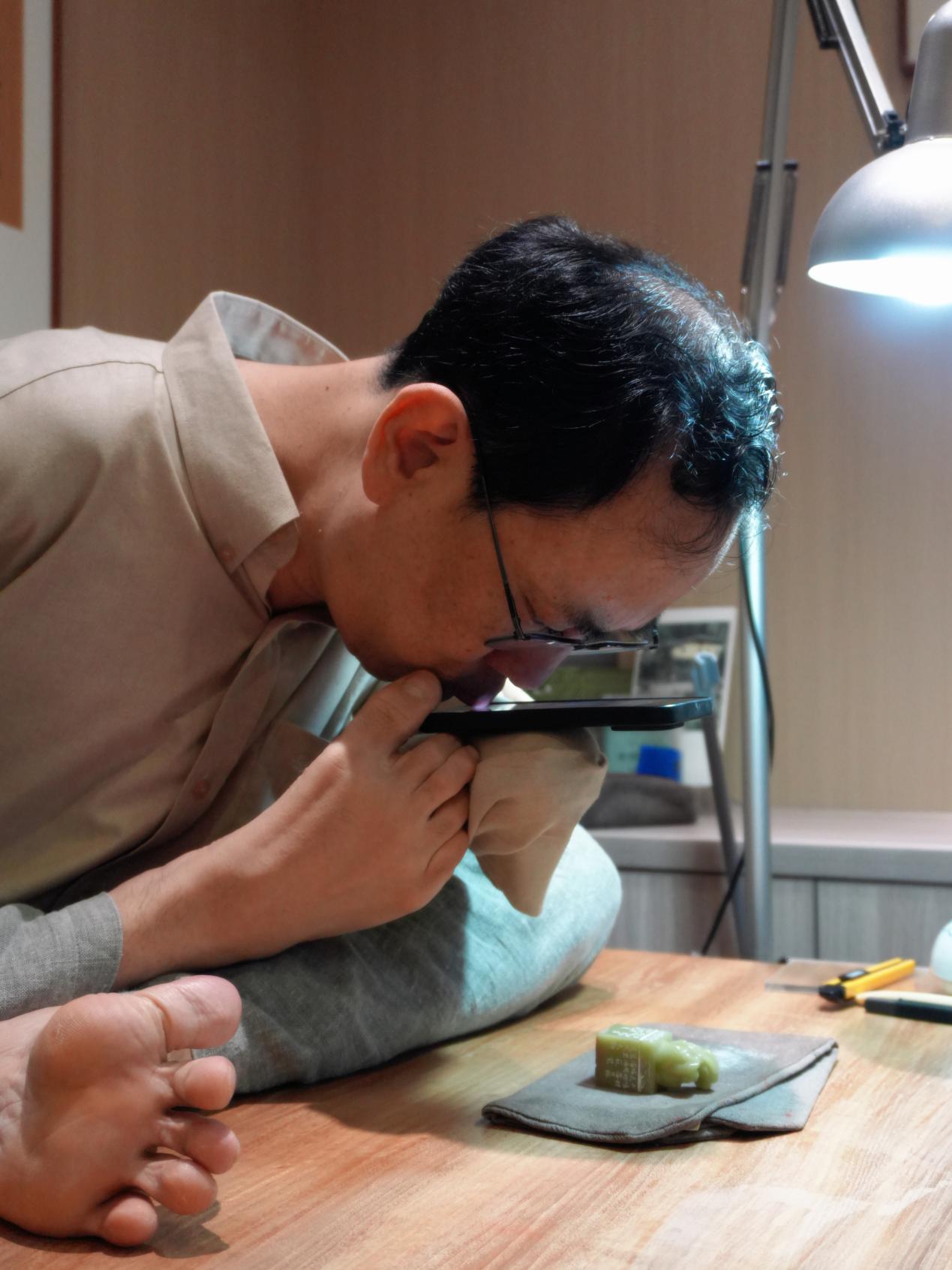 孔黎翔将完成的印石拍照给主顾,他用右脚和左臂残肢固定手机,用嘴唇碰触手机按键拍照