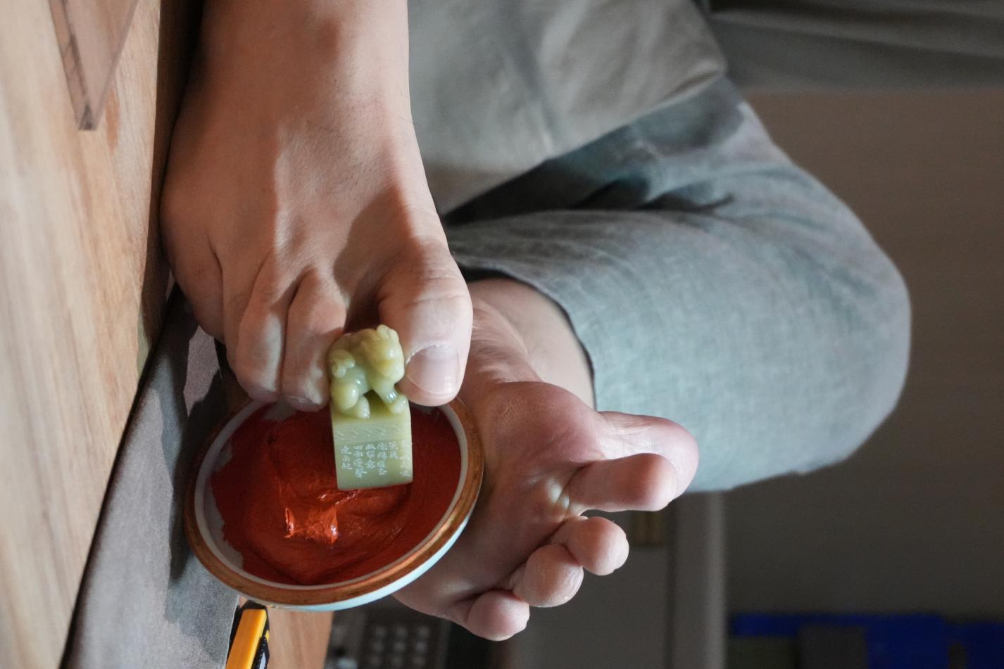 2025年6月15日,天健石室里,孔黎翔用脚趾夹住印石,蘸上印泥