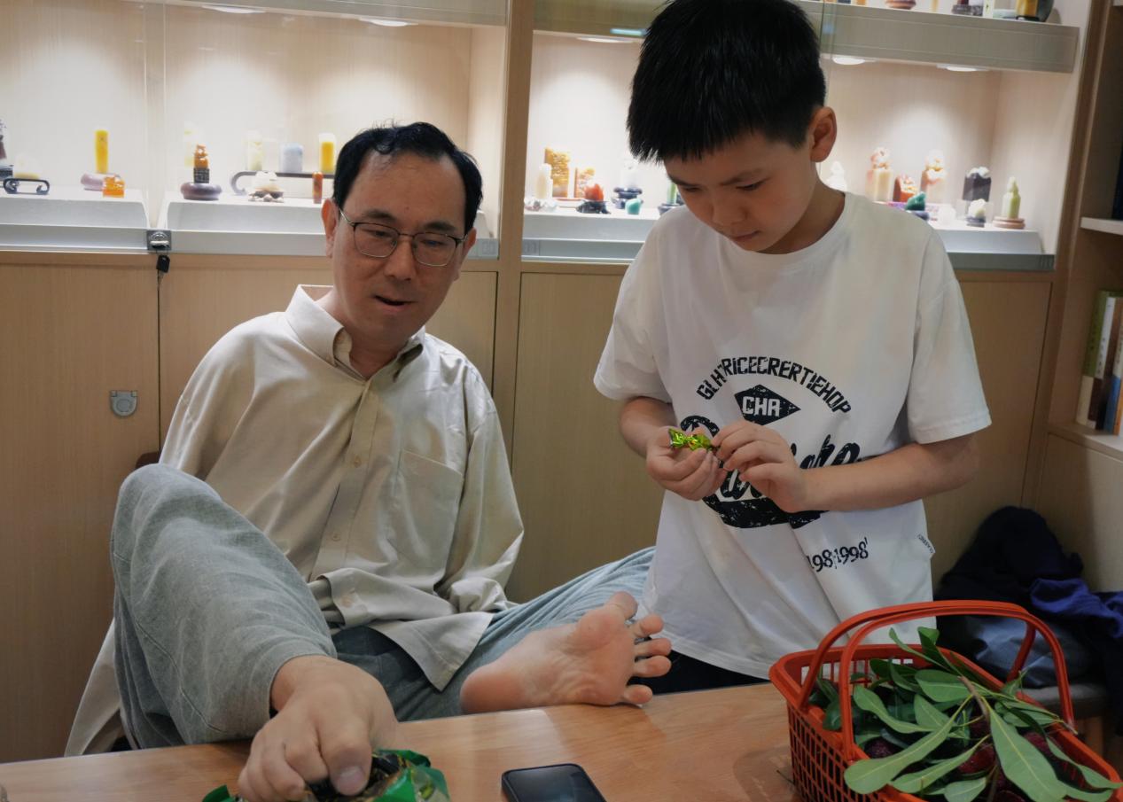 2025年6月15日,孔黎翔在天健石室里给大徒弟的儿子分享自己从日本出差带回来的零食