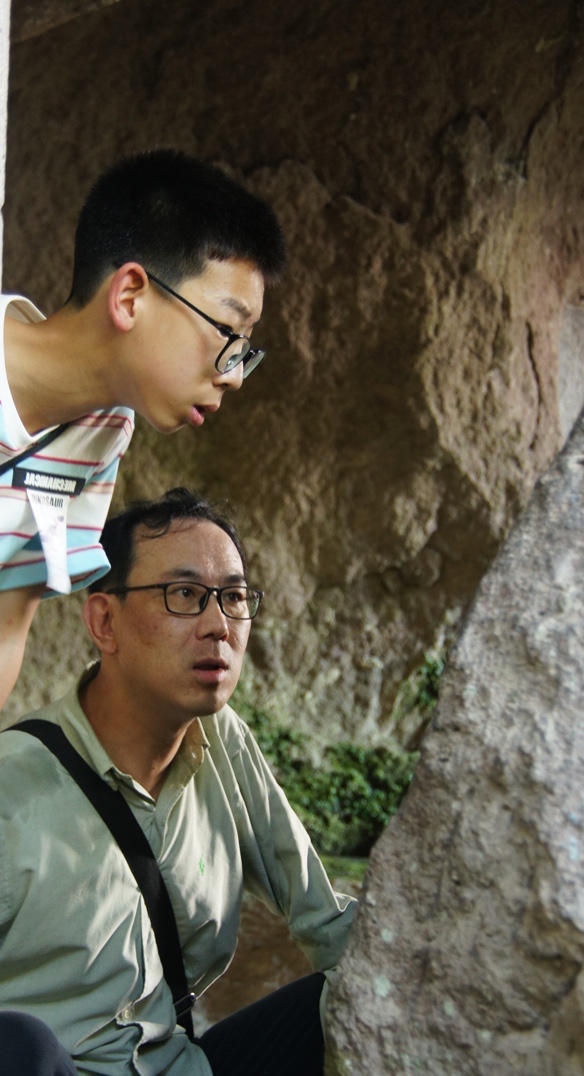 2019年7月,孔黎翔与儿子在缙云仙都游玩时一起观察石碑(受访者供图)