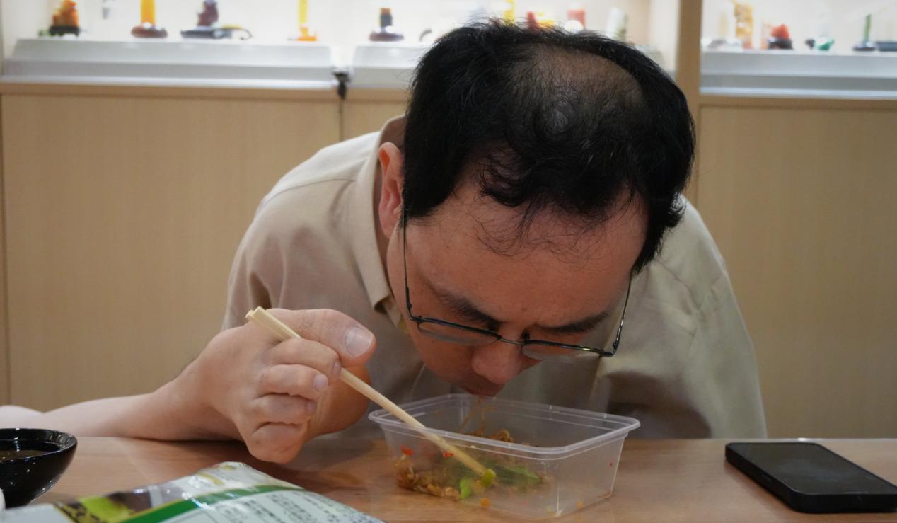 2025年6月15日,天健石室里,孔黎翔熟练地用脚夹着筷子吃饭,吃饭速度一点不慢