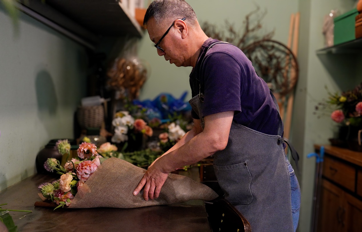 2025年6月4日,程融在做顾客预订的鲜花。顾客要用来送好友,程融选择使用淡雅的花材。