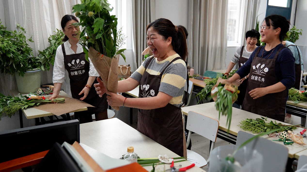2025年5月26日,在闵行老年大学的花艺课堂上,阿姨们聊天取笑、做花艺两不误。