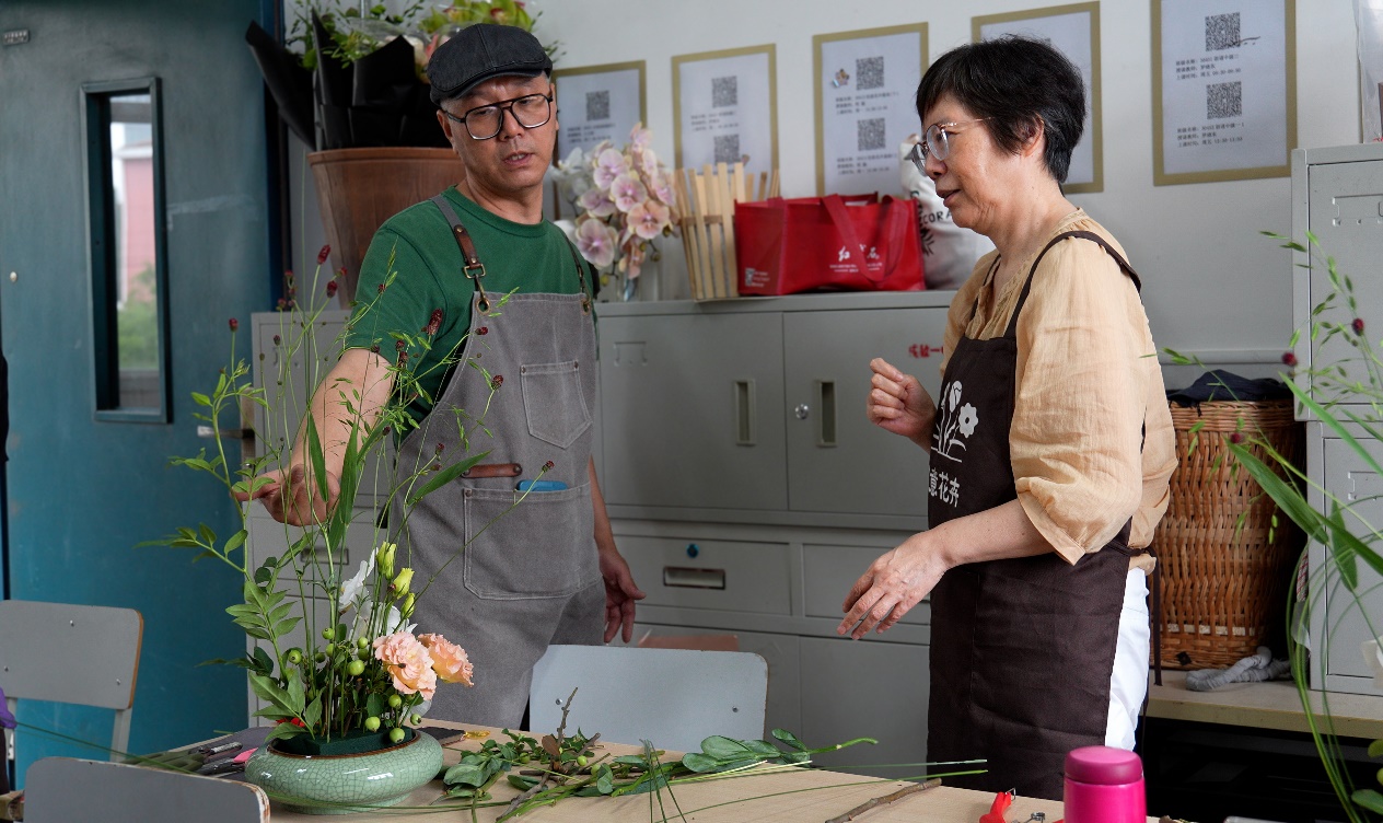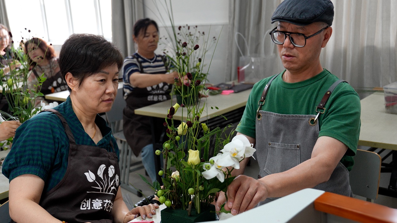 “跟着程老师做花艺,感觉整个人都会变柔软。插花的时候,不仅要动手,还要动脑思考怎么插才好看,根本不会想任何烦心的事情,很轻松愉快。”唐阿姨说。她从2023年开始上程融的花艺课,从初级班上到高级班,表示“我要永远不毕业”。