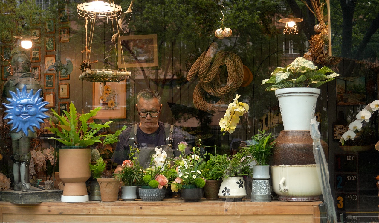 透过壁橱的窗户,在微微发黄的灯光下,看到老唱片机静默伫立在角落,一尊持剑卫士在红漆大木柜上投下影子,几件茶具散落其间,柜子下面放着一排陶器,里面有海棠果、粉玫瑰、九星叶等花材。看了一眼招牌上褪色的“花到家·富贵花鸟艺”字样,推开木门,走了进去。程融正在工作台上制作盆花,没有抬头,继续忙着手头的事情。