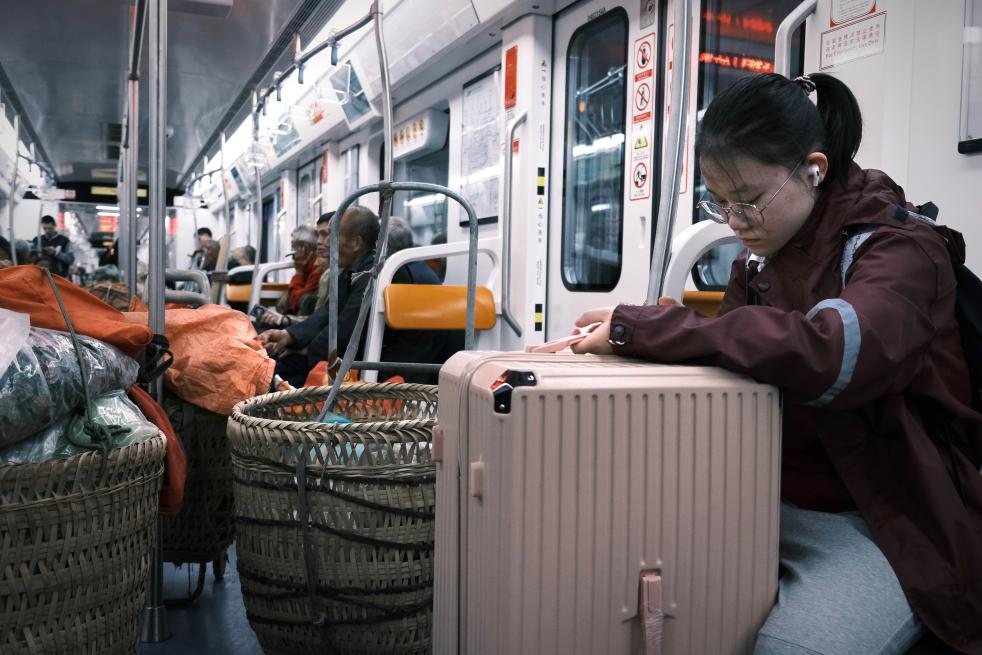 经历一系列换乘的小插曲,菜农们终于搭上了十号线。与四号线不同的是,十号线车厢不再是这群“背篓客”的天地,菜农们背着竹编背篓,穿着沾着泥点的衣裤,和背双肩包、拉行李箱的乘客比肩而立。背篓里的青菜、橘子、桂花随着列车晃动轻颤,与车厢里的短视频声、书包拉链声混在一起,倒也不显违和。