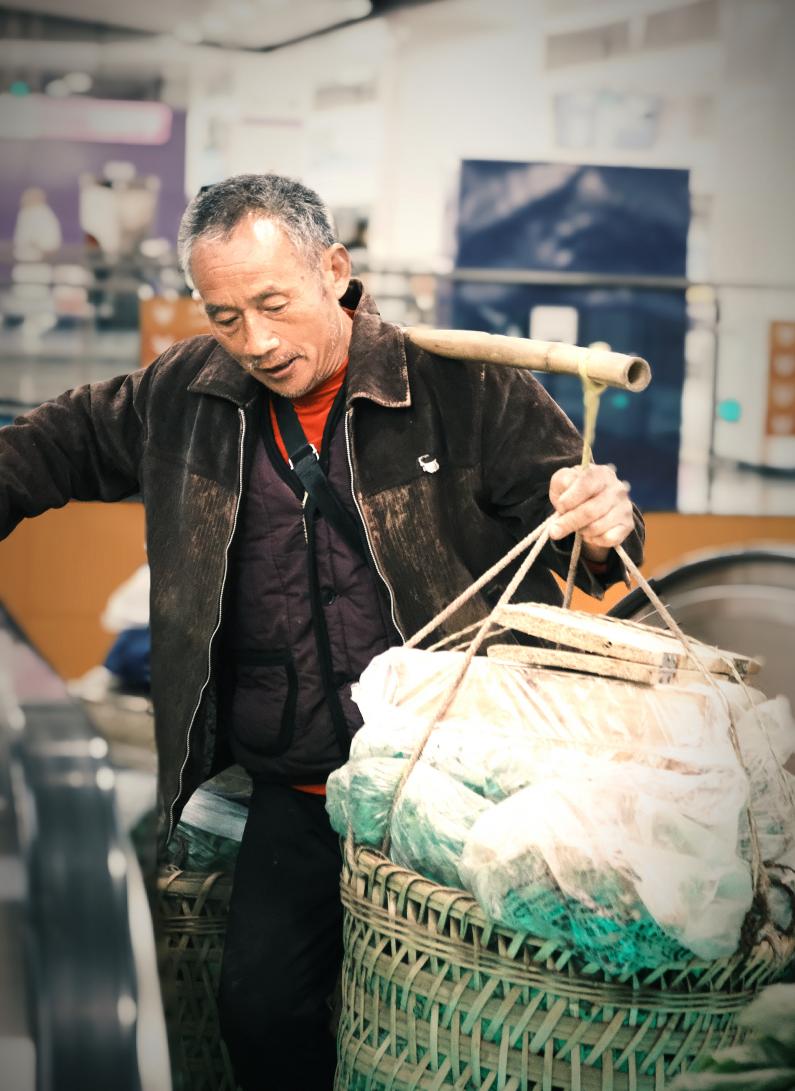 开步去乘扶梯。好在这群“背篓客”有着自己的生活哲学——“不争不抢,凡事‘算老’”。每当拥堵之时,这群菜农中就会响起此起彼伏的“算老”、“莫急”、“让哈他嘛”......就这样,在短暂的“堵车”后,菜农们终于顺利依次乘上了扶梯。