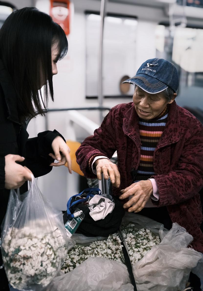 女大学生小梅正在地铁车厢内挑选桂花