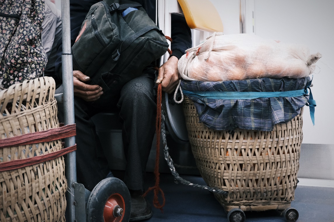 7:00左右,随着方言播报声响起:“石船到了,左边车门打开前,千万不要去挨车门哈,小心遭夹到起受伤哦”,四号线地铁驶进了石船站,菜农们也终于搭上了这条通往市中心的“背篓专线”。随着菜农们逐渐涌进车厢,本空空荡荡的地铁车厢瞬间被菜农和背篓塞满。