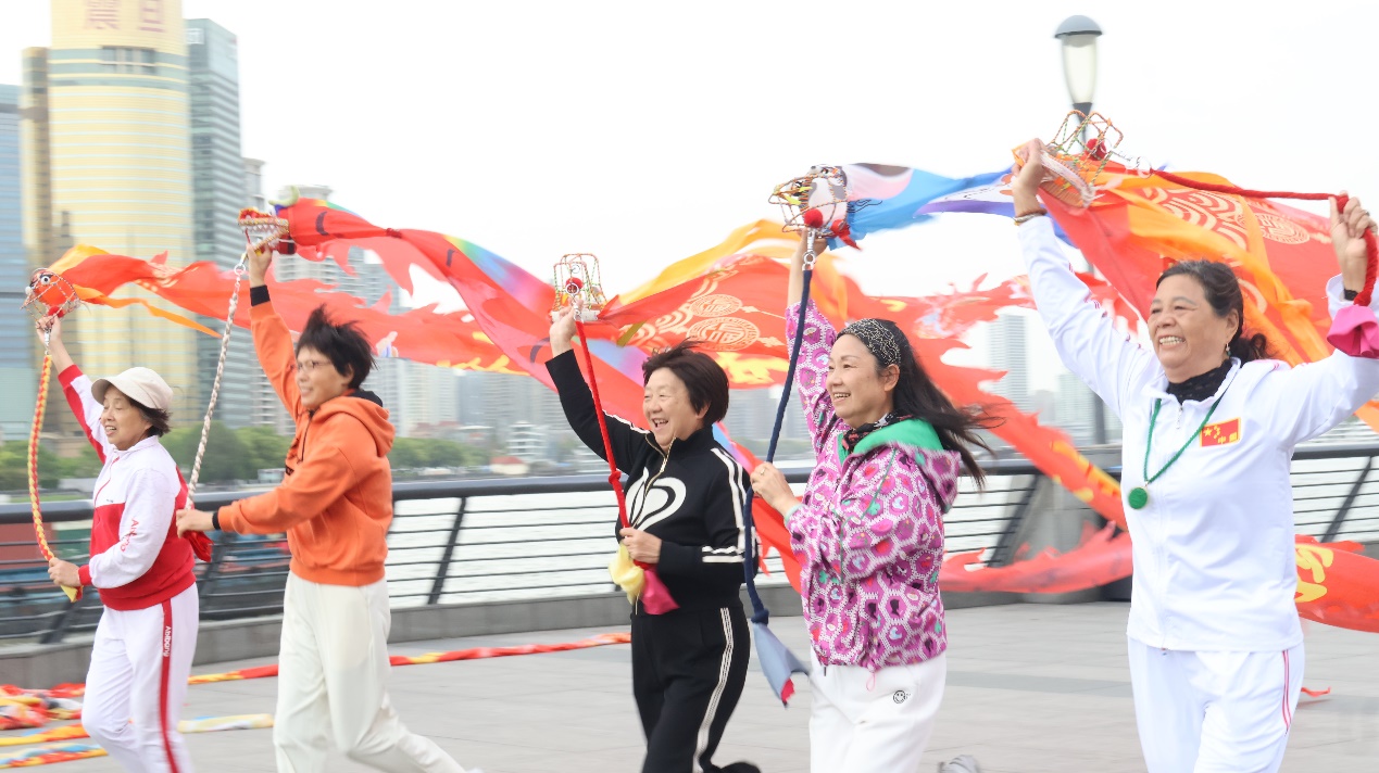 上海东方神韵舞龙队是一支由50多名老年人自发组成的群众性体育团体,他们平均年龄五六十岁,最大年龄七八十岁,但却个个身姿矫健,充满活力,跳龙,抛龙,各种高难度动作都不在话下。