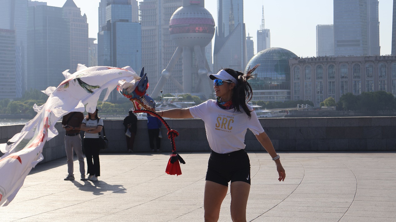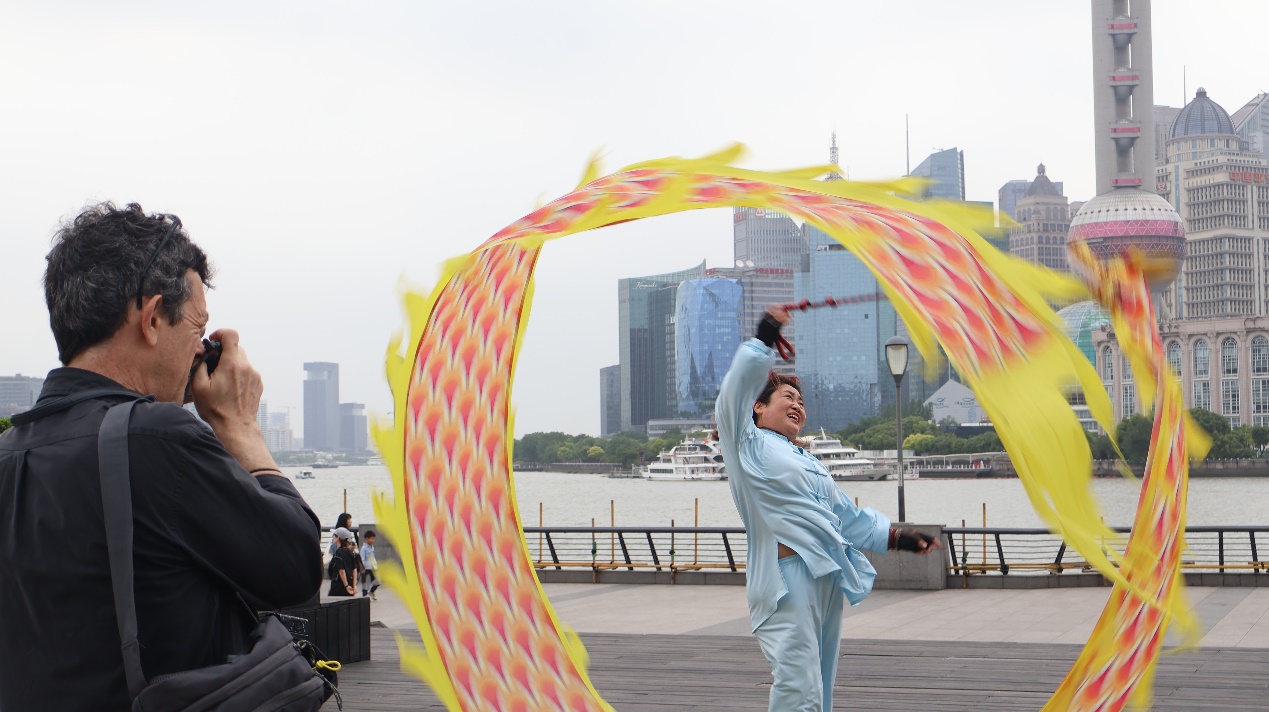染了一头红发的舞林丹心是一名来自广州的游客,六十多岁,作为妇产科医生的她刚刚退休,前来上海旅游。爱美的她看到漂亮的彩带龙,便提出也想试试。“早上6点的外滩,已经有大妈大叔们在舞彩带龙,当我表示挺好奇时,她们很热情教我,看见我能甩起来后,还帮我拍照,上海的市民真的热情友好,点个大大的赞!”她在朋友圈分享在上海外滩舞龙的喜悦。