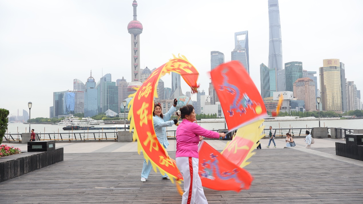 舞龙队常在外滩锻炼,也会到处自发组织、参加活动演出,一展东方神韵的风采。