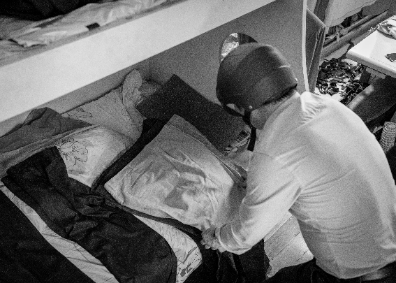 芦师傅在整理当天要送的衣服,由于室内太挤,只能摊在自己睡的床上