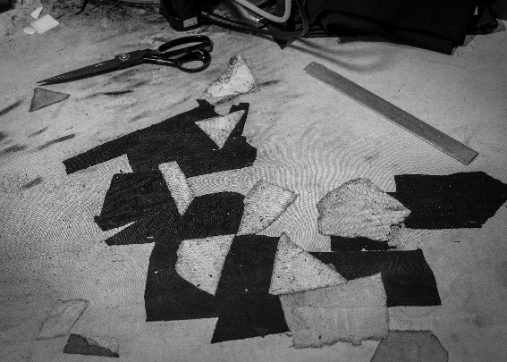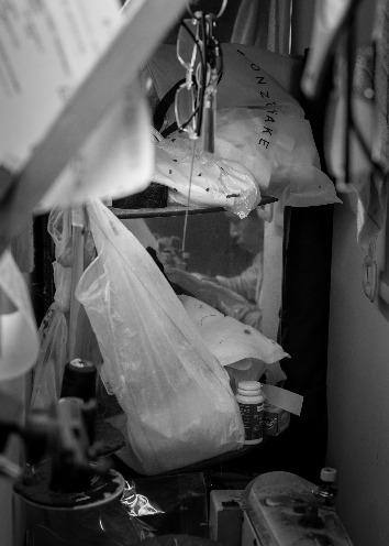 这间102室,既是他的家,也是他的工坊。不到十平米的狭小空间,芦师傅将工作台塞进进门到卧室的狭长过道里。桌面一米高、两米长,几乎占去过道的一半,另一侧空间仅足以容一人侧身而过,每一步都显得拥挤。裸露的电线悬挂着一只破旧的灯泡,冷白的光把台面照得晃眼。台面上铺着一整张泛黄的白布,那些被熨斗烫出的洞眼,早已被芦师傅用边角布料缝合起来,仿佛是他对每个细节的坚持与呵护。布尺、划粉、裁片随意散落,却又整齐有序,每一寸布料和工具仿佛都承载着他对这份手艺的敬畏。
