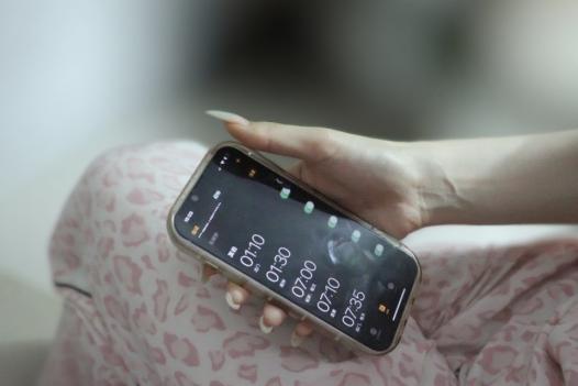 林芳展示她上夜班时定的闹钟