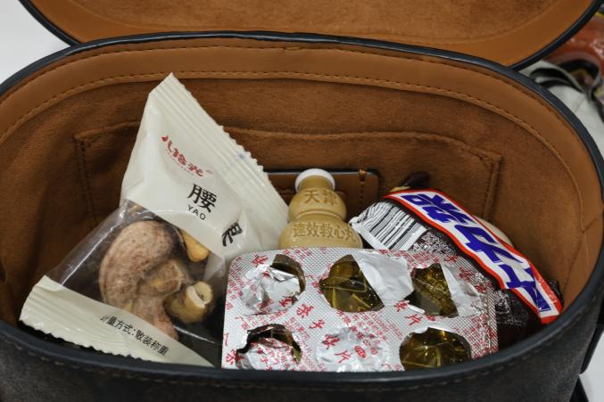 林芳上班时带的包,装有气垫、口红、雨伞、零食、巧克力、润喉糖、速效救心丸等物品。