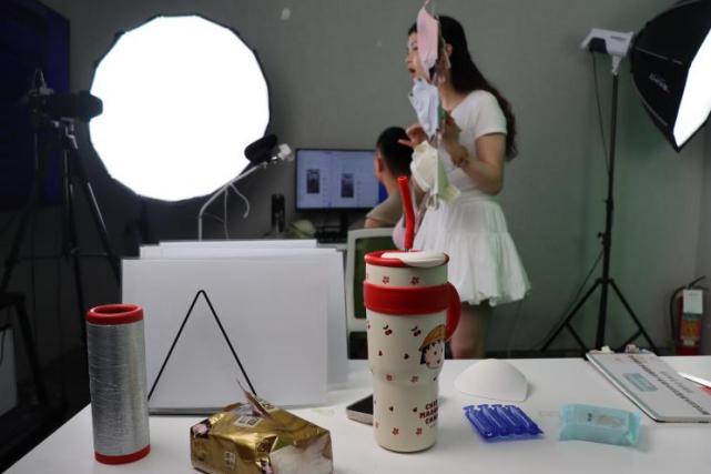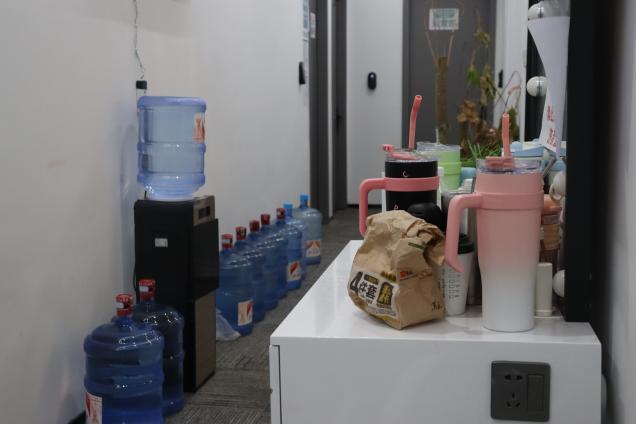 直播间外的走廊上,放满了喝完的桶装水,以及主播们的大号水杯。
