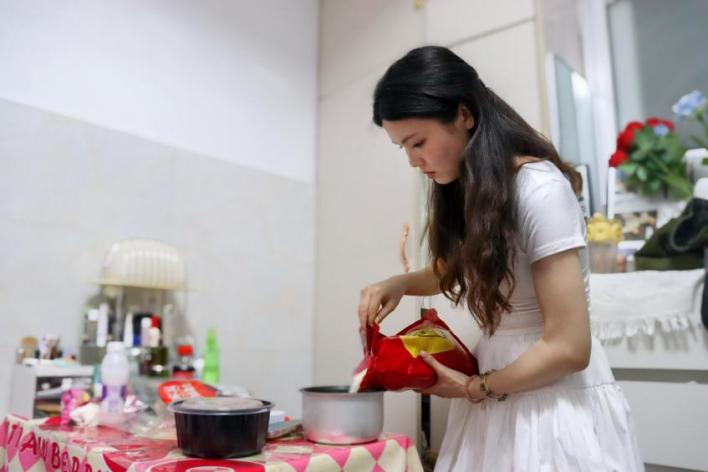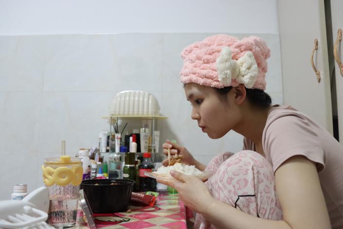 4小时不间断的站播无疑是消耗体力的,一回到出租屋,刚脱下外套,林芳就拿出了电饭煲煮饭,并用微波炉加热了晚饭剩下的外卖,当作宵夜的配菜。用手机调出最近在看的电视剧,一边吃饭一边追剧,这是林芳一天中难得的休闲时刻。
