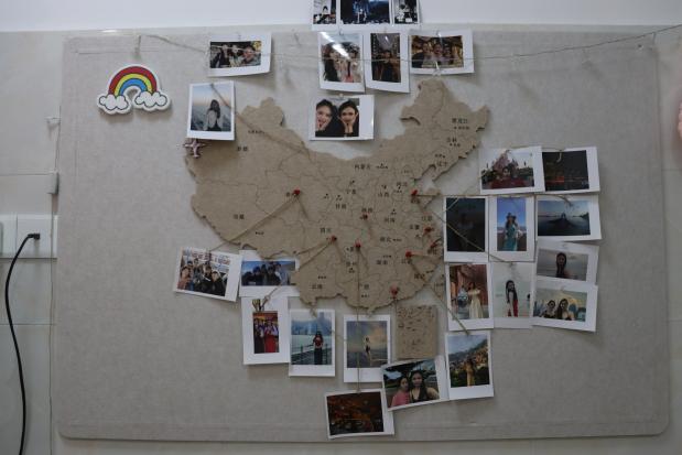 林芳自己DIY的中国地图,上面挂满了她旅行时的照片,以及与朋友们的合影。