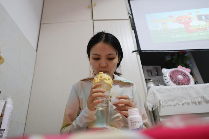 只有在向观众展示KT板时,林芳才能趁机补充水分。