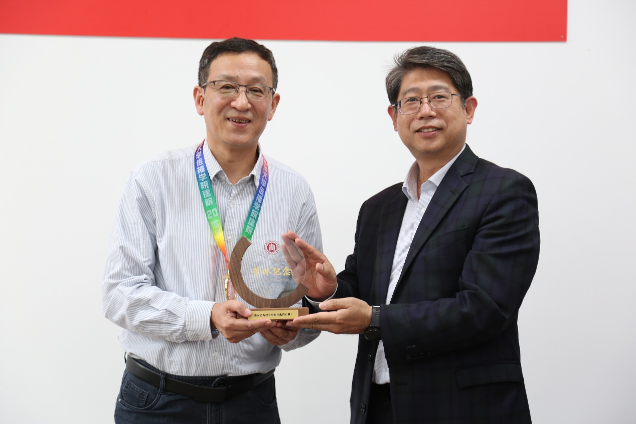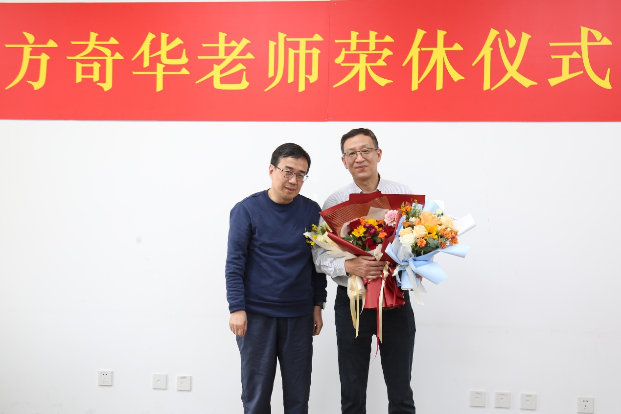 王峰院长代表全院向方奇华老师颁发“传薪”奖章及荣休纪念品,感谢方老师多年来对学院发展的无私奉献;朱文佳书记送上凝聚学院全体教职工祝福的荣休纪念册,一张张照片定格方奇华老师与学院师生并肩奋斗、攻坚克难的往昔足迹,传递美好祝愿。